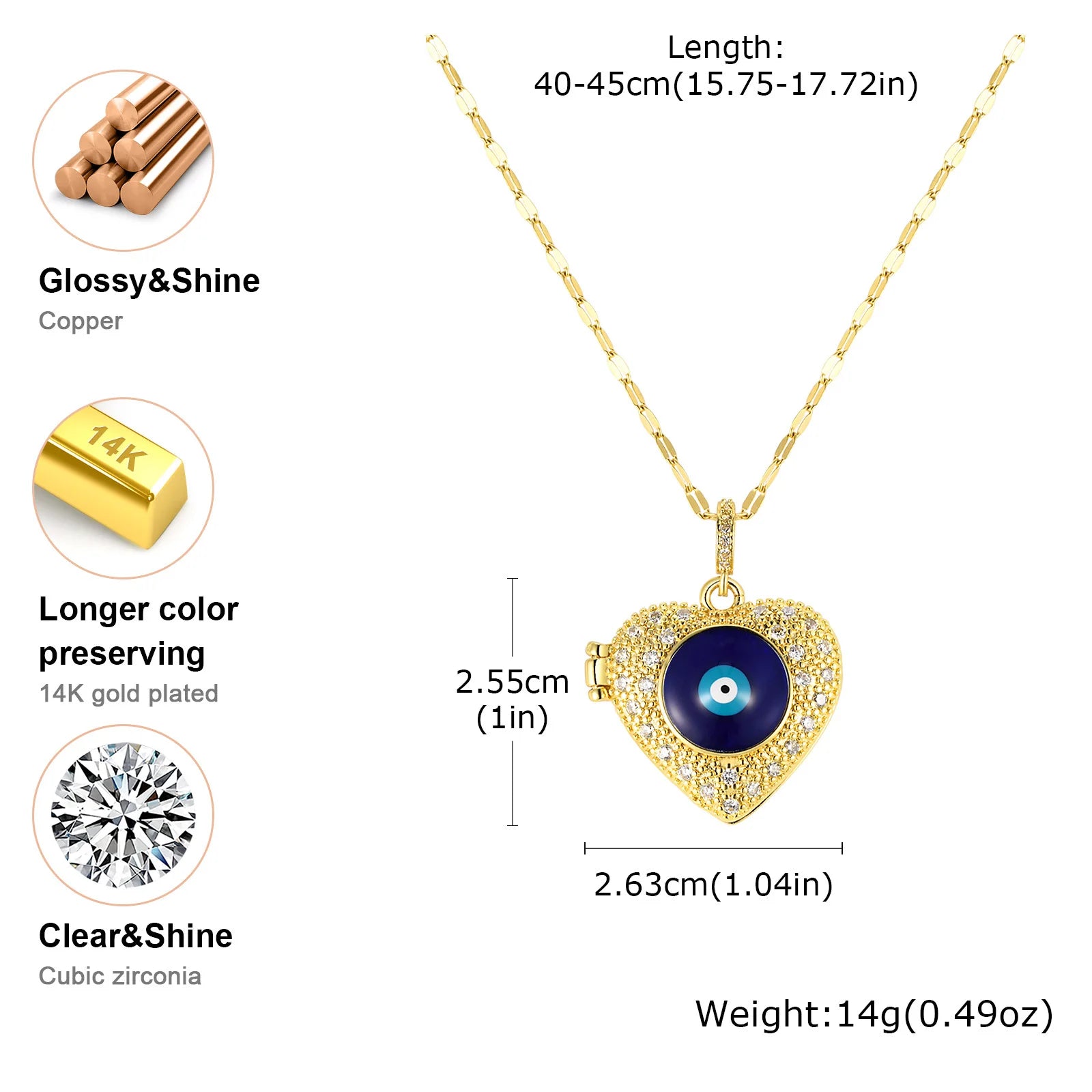 Featuring a gold-plated heart pendant adorned with shimmering zircon stones and a blue evil eye centerpiece, it represents love, safety, and positive energy.